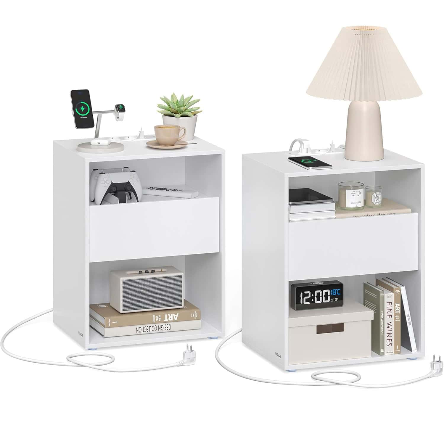 VASAGLE Set 2 noptiere cu porturi USB si prize, sertar si rafturi deschise, 45x35x58 cm, alb mat Mob360