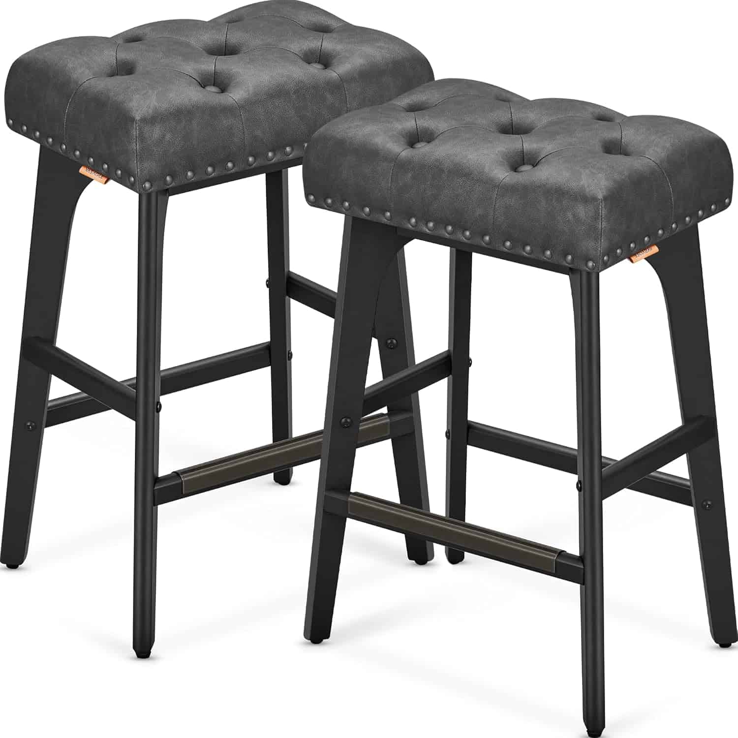 - Acest set de 2 scaune VASAGLE aduce o nota de eleganta in zona de bar sau dining. Tapiteria din piele ecologica neagra, detaliile cu nasturi si capse decorative, alaturi de picioarele din lemn cu suport metalic pentru picioare, creeaza un aspect sofisticat si confortabil. Caracteristici principale: