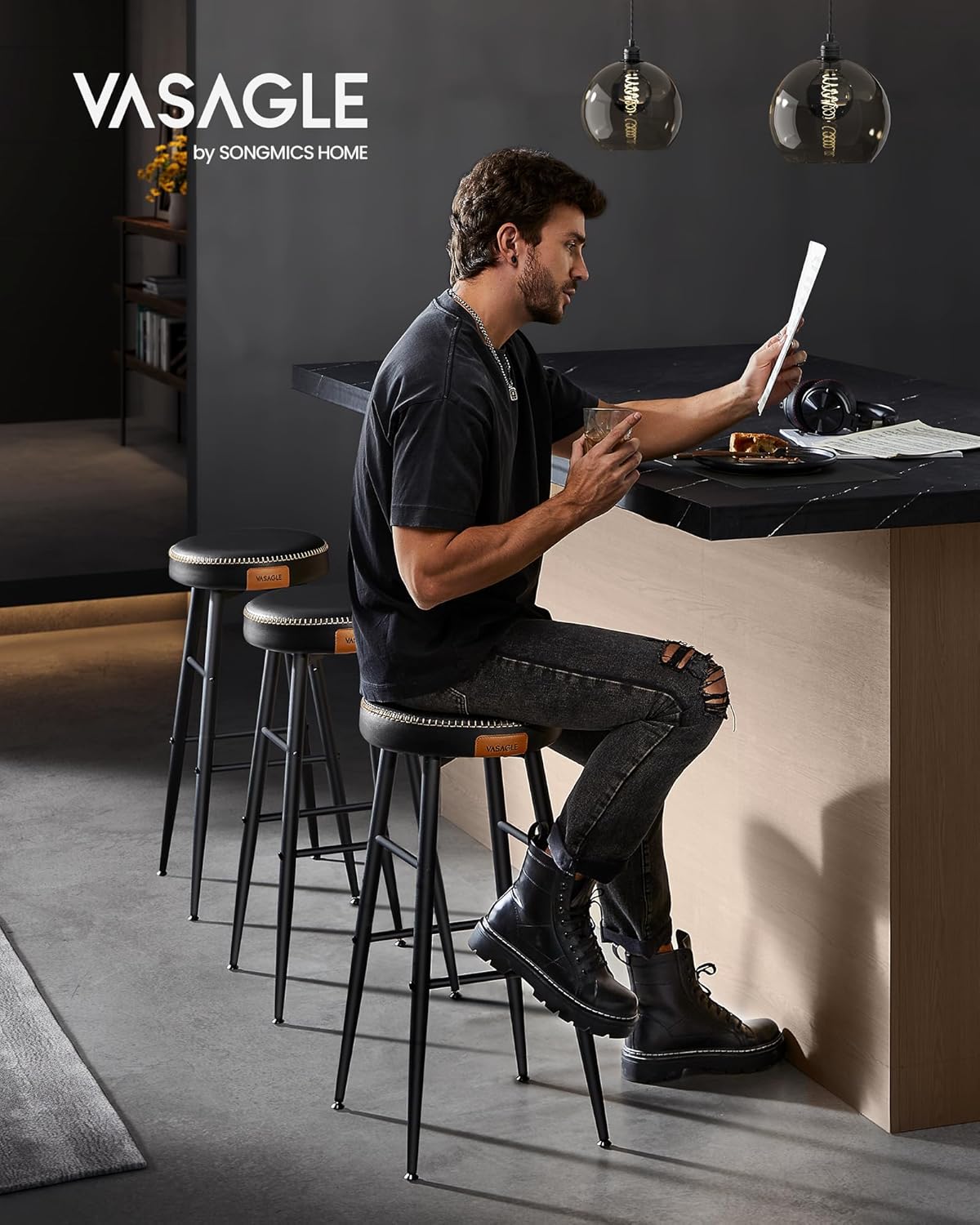 VASAGLE Set 2 scaune bar Ekho, tapitate PU, inaltime sezut 76 cm, 52×76 cm, negru Mob360