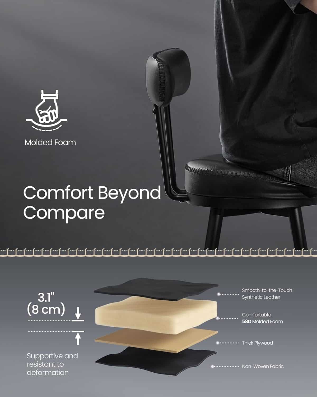 VASAGLE set 2 scaune de bar rotative 360°, cu spatar, inaltime 101 cm, piele sintetica, cadru otel, stil modern, negru Mob360 – produs disponibil în magazinul Mob360.