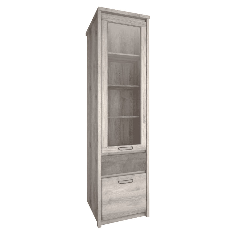 Material: PAL melaminat Culoare: castan Nairobi / onix Dimensiuni (LxAxÎ): 56x40x210 cm Grosime material: 1,6-3,2 cm Mânere metalice Culoarea mânerelor: negru Vitrină Cu sticlă Cu rafturi Cu uşă dublă Un sertar Capacitate sertar: 5 kg Picioare din plastic Design modern Vă recomandăm să ataşaţi mobilierul de perete Livrată dezasamblată