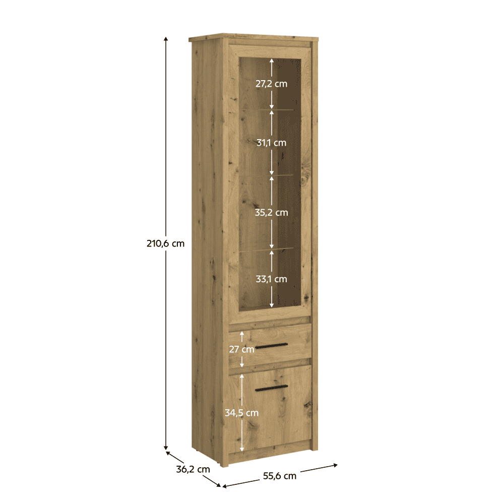 Material: PAL melaminat / margini ABS Culoare: stejar Artisan Dimensiuni (LxAxÎ): 55,6×36,2×210,6 cm Grosimea materialului: 1,6-3,2 cm Mânere din plastic Culoarea mânerelor: neagră Dulap cu uşi Sertar Înălţimea sertarului: 27 cm Include uşă de sticlă Rafturi de sticlă Capacitatea de încărcare a raftului de sticlă: 3 kg Vă recomandăm să ataşaţi mobilierul de perete Livrată dezasamblată