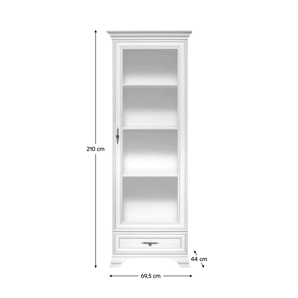 Material: DTD laminat/sticlă Culoare: alb alpin Dimensiuni (lxAxh): 69,5x44x210 cm Grosime material: 1,6 cm Mânere metalice Culoarea mânerelor argint antic Sertar Portanţă sertar: 3 kg Include uşă cu sticlă Cu poliţă Portanţă poliţă: 4 kg Pe picioare. Înălţime picioare: 8 cm Recomandăm fixarea de perete Livrat dezasamblat