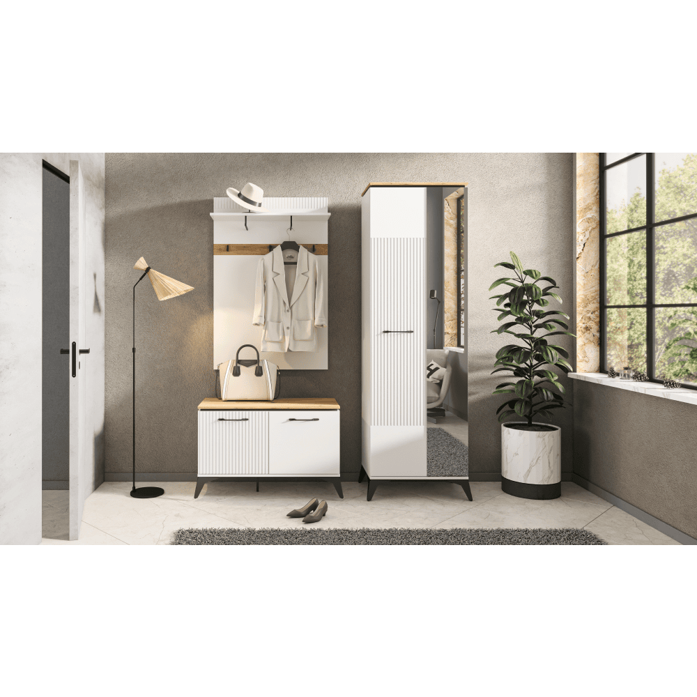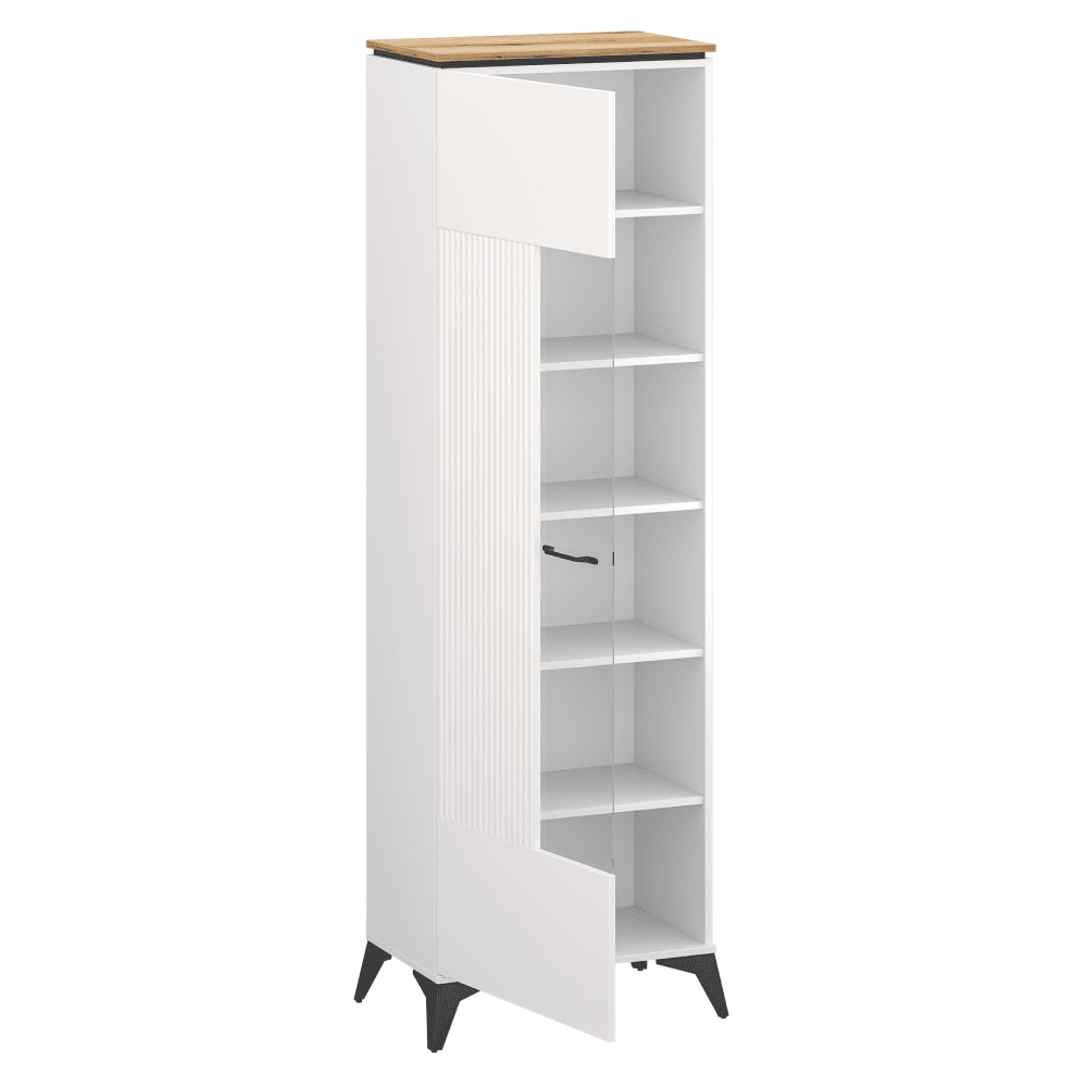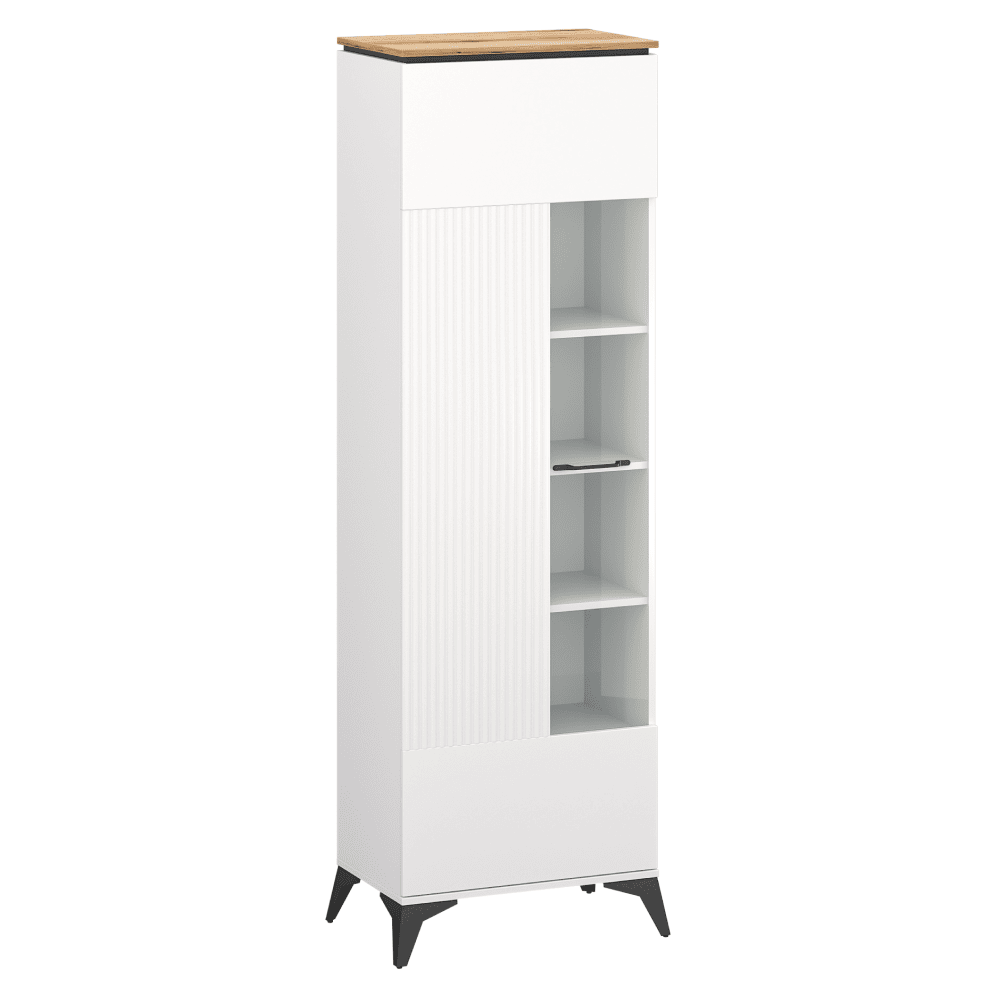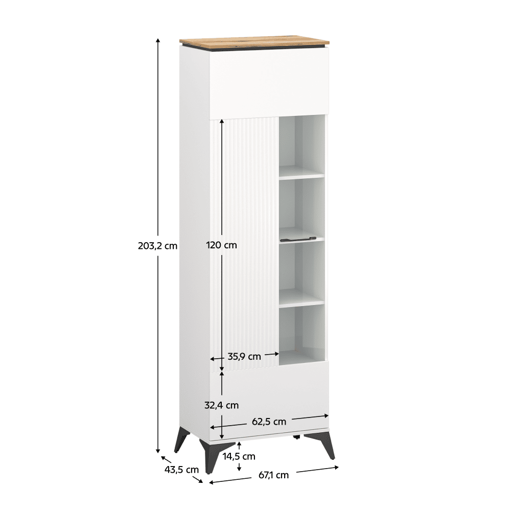 Material: DTD laminat/MDF înfoliat/PVC Culoare: alb/stejar evoke Dimensiuni (lxAxh): 67,1×43,5×203,2 cm Grosimea materialului: 1,6 cm Cu o uşă Vitrare cu sticlă Uşile sunt universale Posibilitatea de a monta uşa pe partea dreaptă sau stângă Poliţă Portanţă poliţă:: 3 kg Mânere metalice Culoare mânere: neagră Pe picioare Culoare picioare: negre Înălţime picioare: 14,5 cm Uşi frezate decorativ Design modern Fără iluminare cu LED Opţiunea de a achiziţiona iluminare cu LED Recomandăm fixarea de perete Livrată dezasamblată