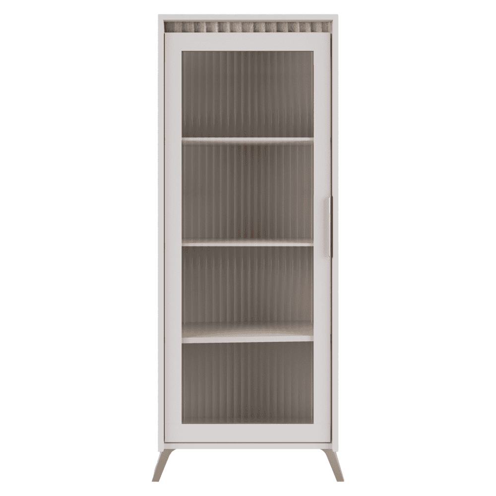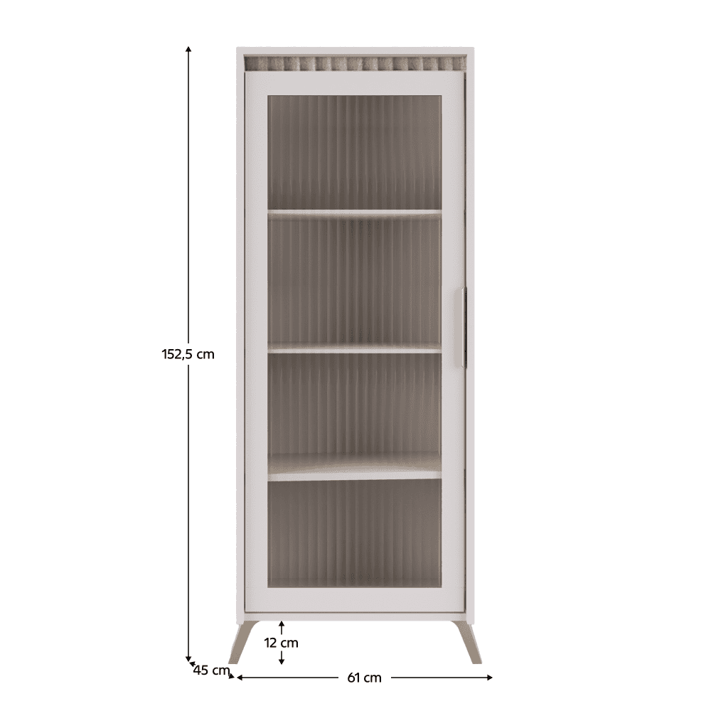 Material: DTD laminat/MDF înfoliat/folie PVC/sticlă Culoare: caşmir/stejar sonoma Dimensiuni (lxAxh): 61x45x152,5 cm Grosimea materialului: 1,6-1,9 cm Cu o singură uşă Uşă cu sticlă Grosimea sticlei: 0,4 cm Sticlă lustruită Sticlă securizată Sticlă canelată Rafturi din sticlă transparentă Cu mâner Material mâner: metal Pe picioare Culoarea piciorului: naturală Înălţimea piciorului: 12 cm Balamale Margine: hârtie impregnată cu polimeri termoreactivi/PVC Grosimea materialului ABS: 0,5 mm Grosime placă aglomerată partea din spate/fund sertar: 0,3 cm Culoare partea din spate/fund sertar: alb Frezare decorativă Design modern Livrat dezasamblat