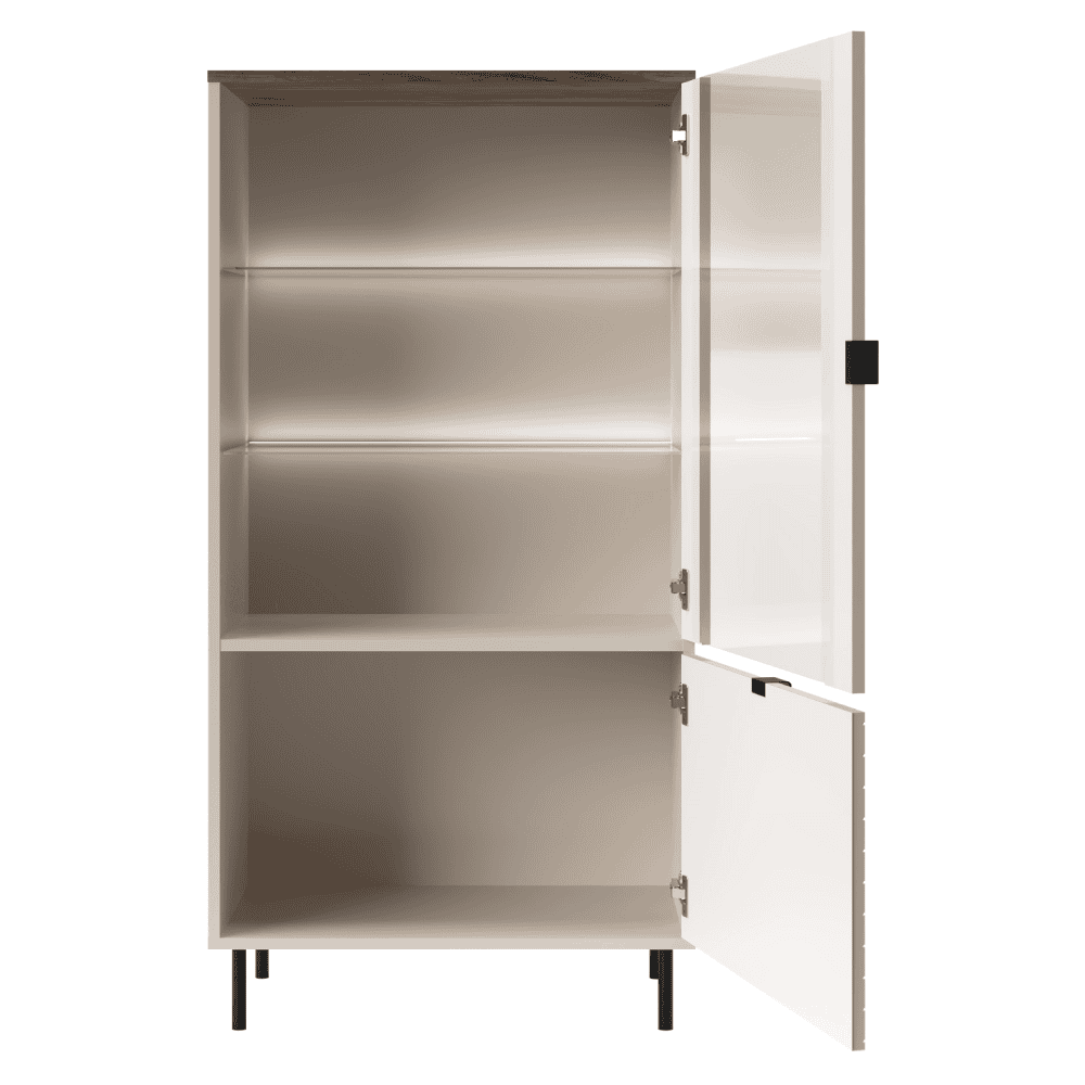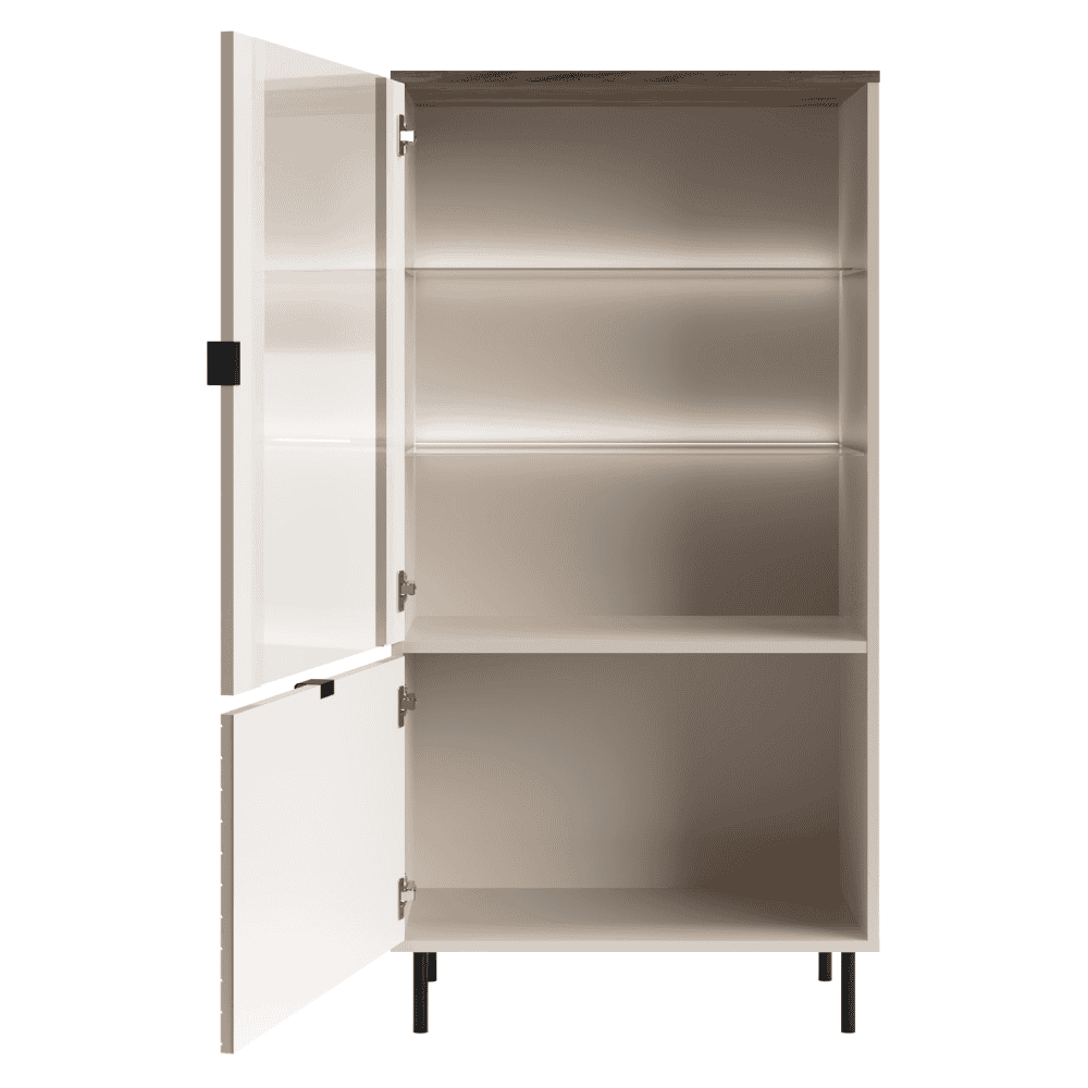 Material: DTD laminat/MDF înfoliat/margini ABS/sticlă Culoare: caşmir/stejar castello Dimensiuni (Lxlxh): 63,4x40x135,2 cm Grosime material: 1,6 cm Cu două uşi Două dulapuri Dimensiunile dulapului de jos (Lxh): 59,6×39,6 cm Cu poliţe Vitrat cu sticlă Dimensiuni sticlă (Lxh): 47,6×77,3 cm Uşă universală Cu mânere Materialul mânerelor: metal Culoare mânere: neagră Pe picioare Materialul picioarelor: metal Culoarea picioarelor: neagră Înălţimea picioarelor: 12 cm Portanţă poliţă: 5 kg Portanţă poliţă de sticlă: 3 kg Uşi decorative Design modern Vă recomandăm să-l fixaţi de perete Fără iluminare cu LED-uri Opţiunea de a achiziţiona iluminare LED Livrat dezasamblat