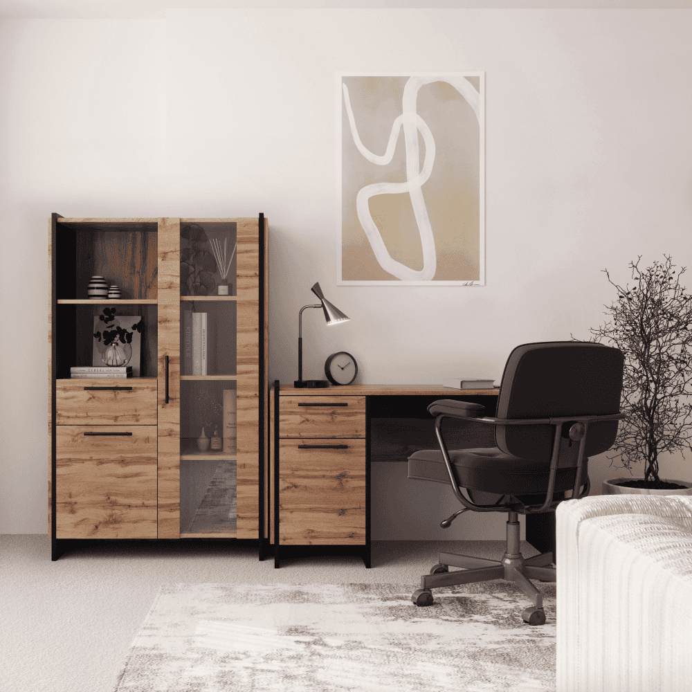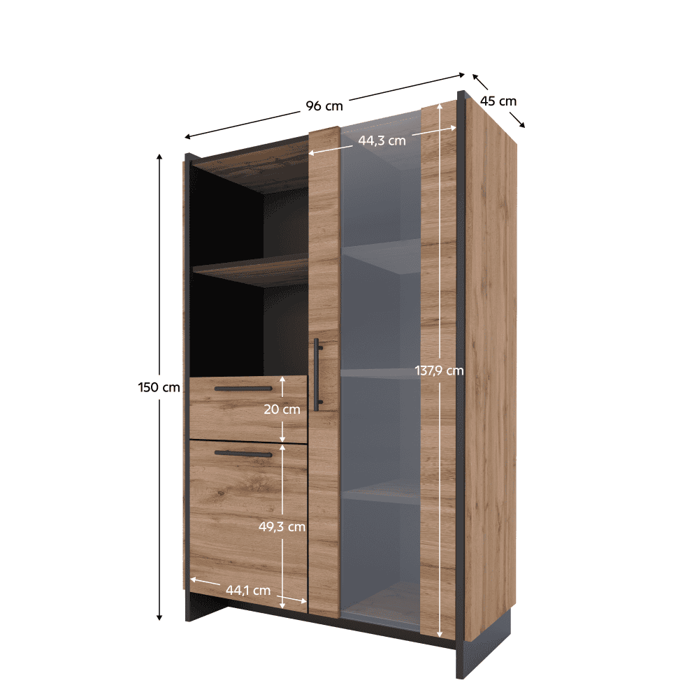 Material: DTD laminat/margini ABS Culoare: stejar wotan/albă Dimensiuni (Lxlxh): 96x45x150 cm Grosime material: 1,6 cm Mânere metalice Culoare mânere: negru Include uşă cu sticlă Dulap cu uşă Cu poliţe Portanţă poliţă: 5 kg Spaţiu de depozitare deschis Sertar Portanţă sertar: 5 kg Înălţime sertar: 20 cm DTD dublu laminat Picioare din plastic Picioare din plastic Fără Iluminare LED opţional se poate cumpăra iluminare LED Design modern Vă recomandăm să-l fixaţi de perete Se livrează dezasamblat