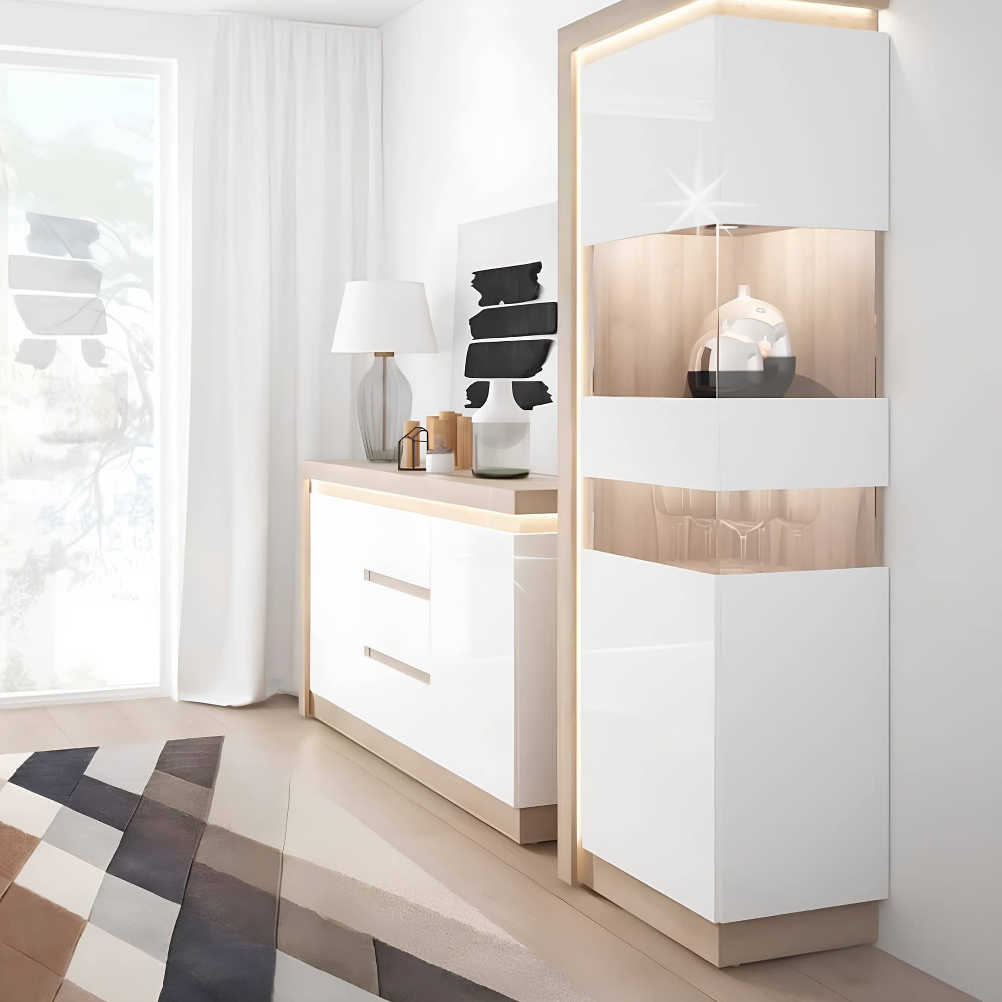 Vitrină LYOV03P din setul modular LEONARDO în culoare stejar riviera/alb cu luciu extra ridicat